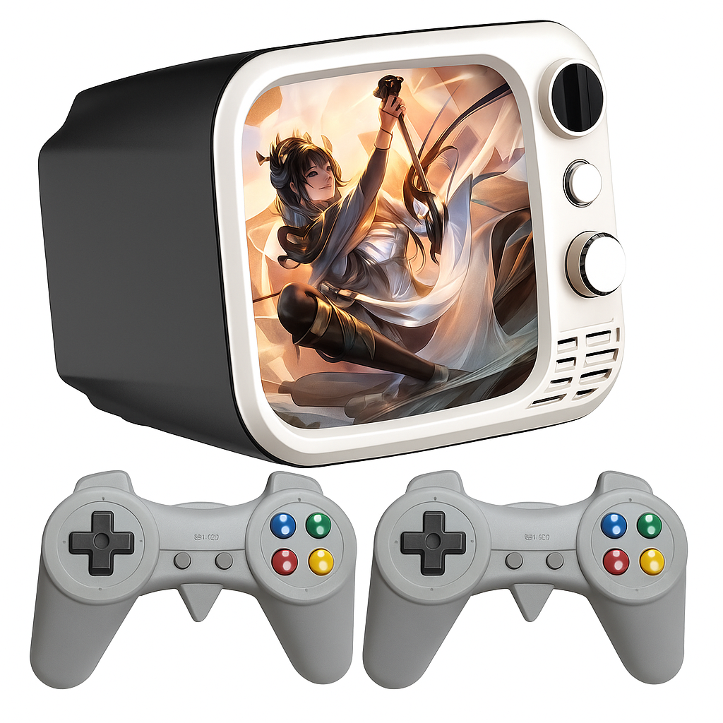 Este mini console retrô une design vintage e diversão moderna em um só produto. Inspirado nas TVs antigas, ele traz um visual único e irresistível para quem ama nostalgia e games.